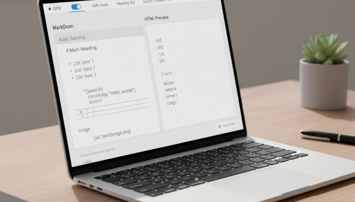 Concept: A minimalist “Markdown → HTML” interface with two side-by-side panels: left shows Markdown (headings, lists, a table, and an image placeholder) and right shows the corresponding clean HTML preview. A small toolbar displays options like GFM, Safe mode, Heading IDs, and Export: Snippet / Full. Neutral UI—no real brand names or personal data.