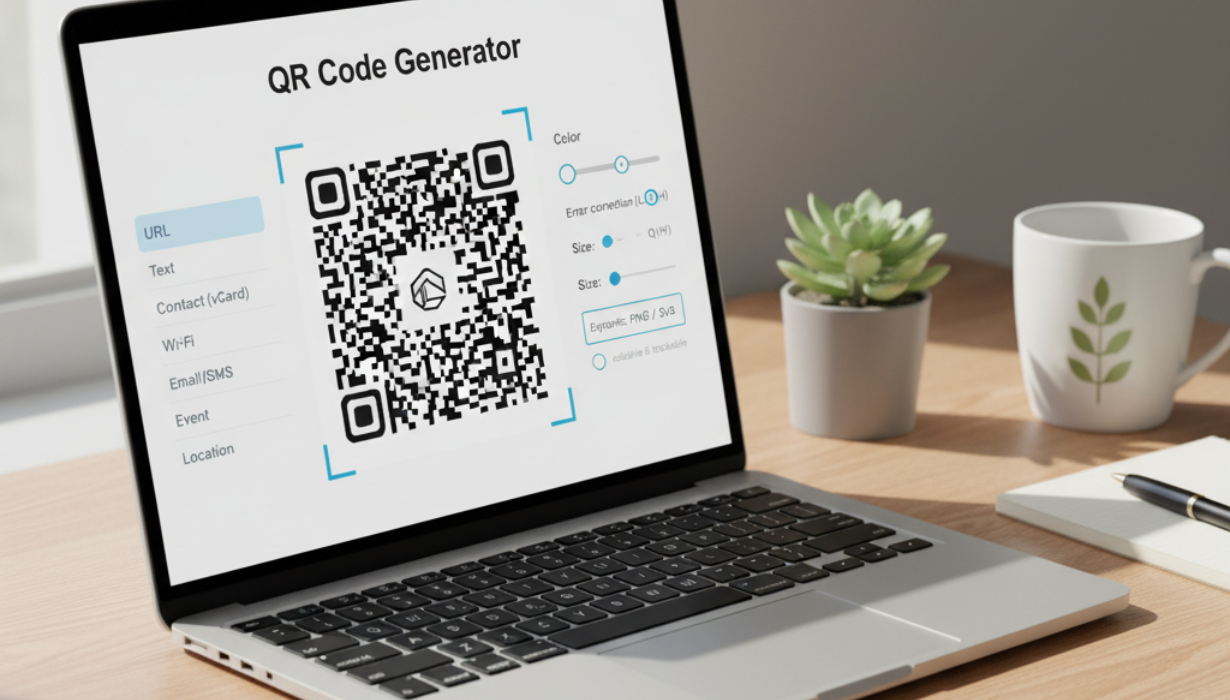 Concept: A clean “QR Code Generator” interface on a laptop: left column listing content types (URL, Text, Contact, Wi-Fi, Email/SMS, Event, Location), center preview showing a high-contrast QR with a tiny optional logo, and right-side controls for Color, Error correction (L/M/Q/H), Size, and Export: PNG / SVG. A small toggle indicates Dynamic on/off with a brief note (“editable & trackable”). Neutral UI; no real personal data.