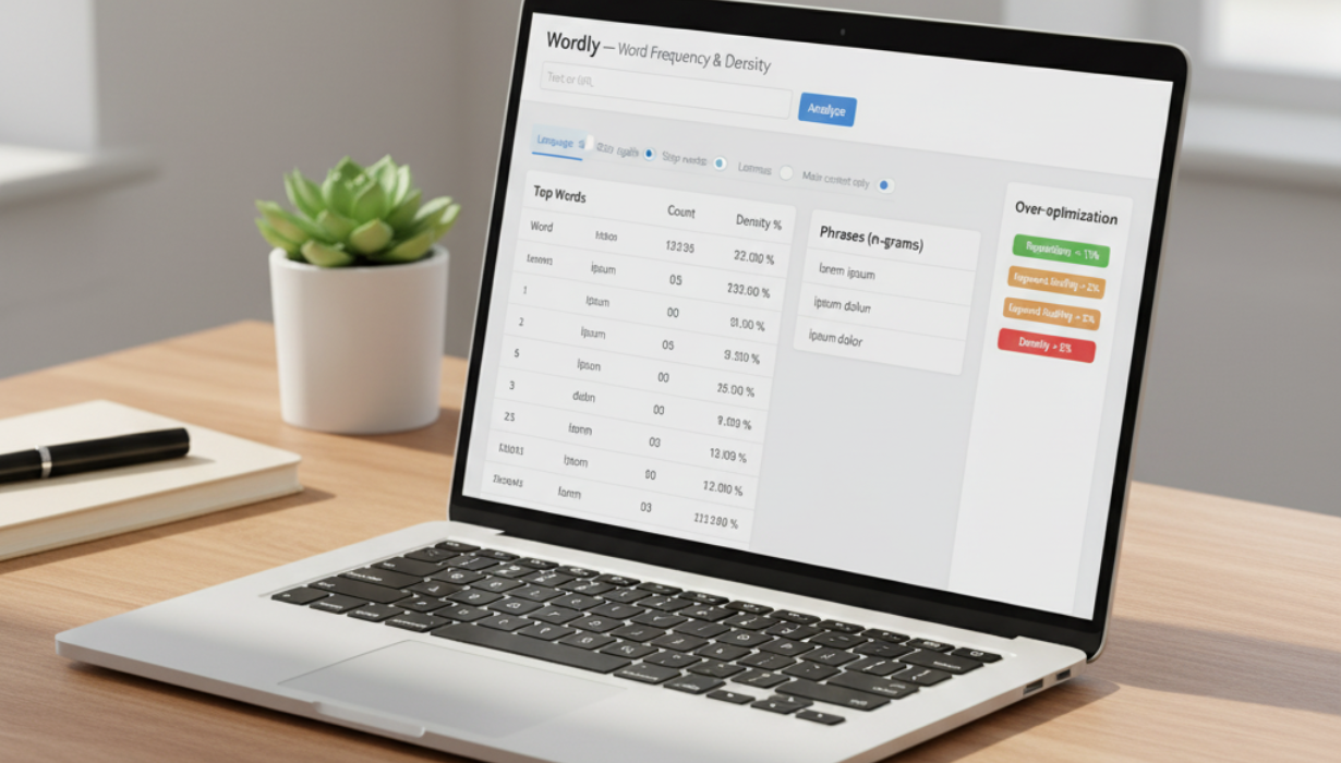 Concept: A minimalist “Wordly — Word Frequency & Density” dashboard on a laptop. Left: input or URL field with an Analyze button. Center: a tidy table of top words with Count and Density %. Right: a Phrases (n-grams) card and a small Over-optimization warnings panel. A toggle bar shows Language, Stop words: On, Lemmas: On, Main content only. Neutral UI, no real brand names.